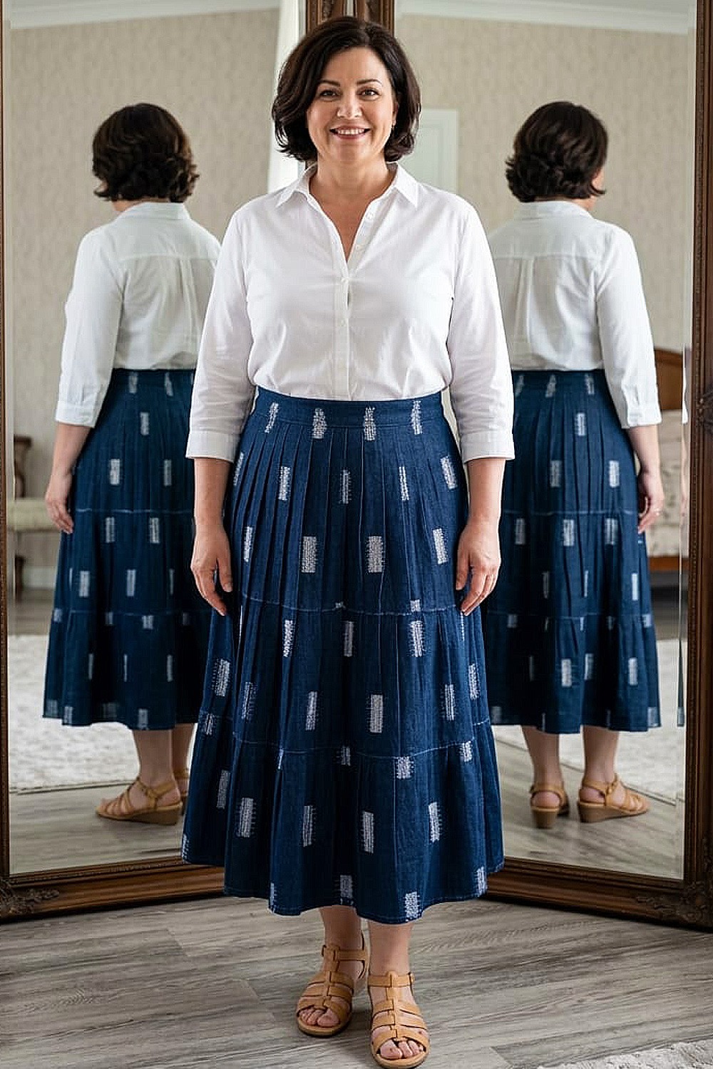 Pentru o ținută office: Combină fusta plisată cu o cămașă elegantă și o pereche de pantofi cu toc.